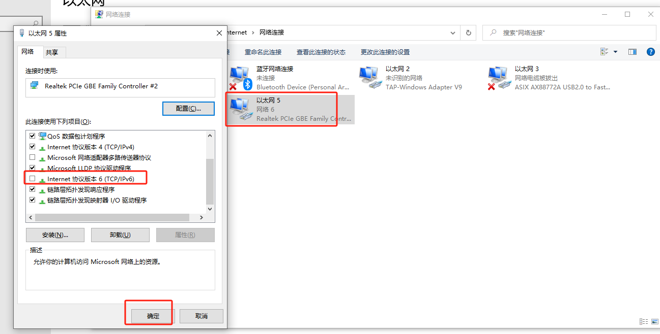3.去掉IPv6選項前的勾,點確定