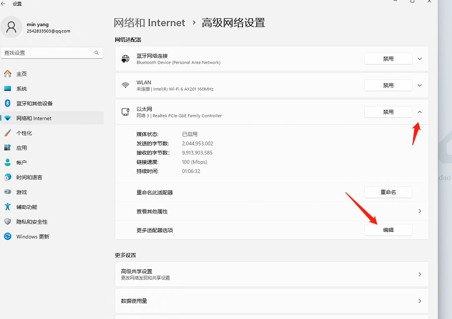 2.找到本地以太網,點后面的向下箭頭,點更多適配器選項后面的編輯按鈕